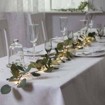 Paristokäyttöinen valoketju eukalyptuksen lehdillä