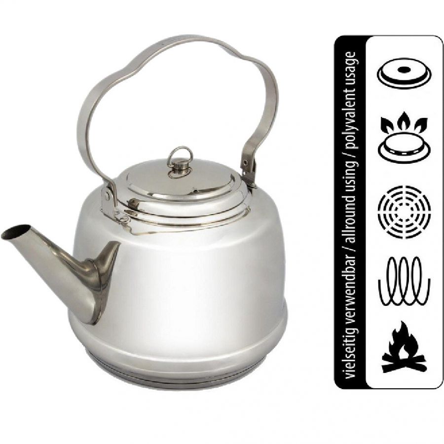 Laadukkaasta ruostumattomasta teräksestä valmistettu Petromax Teakettle varmistaa veden nopean ja helpon lämmittämisen sekä avotulella että kaikentyyppisillä liesillä. Kolminkertainen liikuteltava kahva mahdollistaa vedenkeittimen ripustamisen nuotion yläpuolelle ja tekee sen käsittelystä helppoa. Monikerroksinen pohja takaa optimaalisen lämmön jakautumisen. Teekannu on tyylikäs ja käytännöllinen väline ulkokäyttöön, retkeilyyn ja puutarhanhoitoon sekä sisäkäyttöön. Sitä on saatavana kahdessa koossa. Tekniset tiedot ja ominaisuudet: - Tilavuus: 1,5 litraa - Korkeus: 15 cm - Pohjan halkaisija: 13,5 cm - Paino: 630 g - Materiaali: ruostumaton teräs