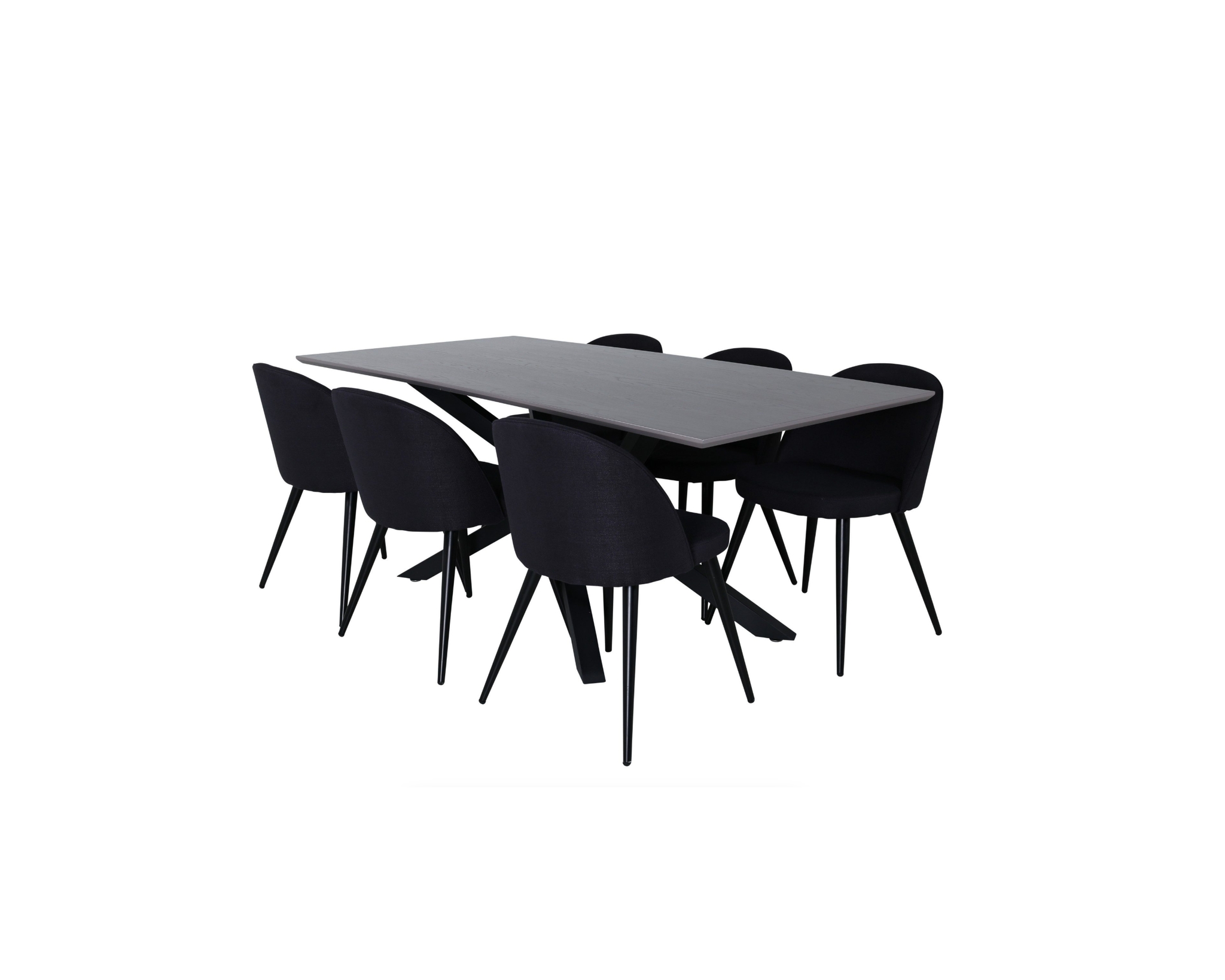 Tyylikäs ja moderni ruokailuryhmä, joka sisältää pöydän ja kuusi tuolia.