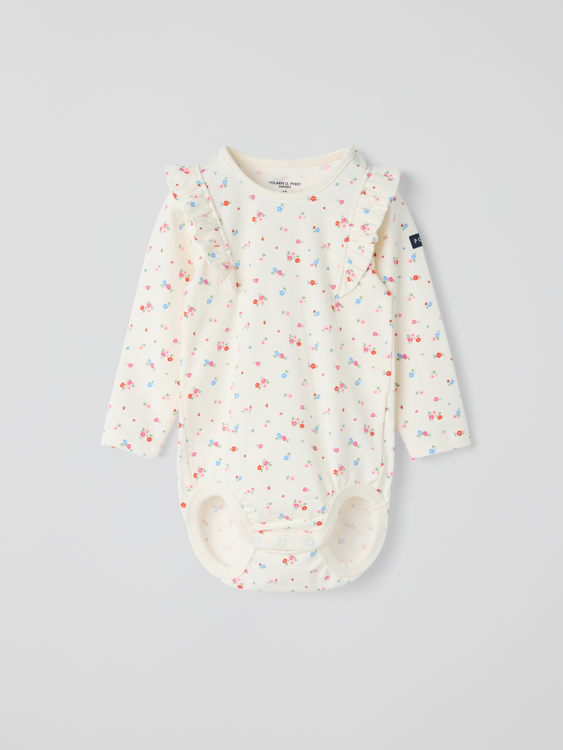 Pehmeä body ekologista puuvillatrikoota, jossa suloiset röyhelöt. Erittäin pehmeät, litteät saumat hellivät herkkää ihoa. Nepparit toisella olalla ja haarassa helpottavat pukemista. Koot 50–62: nepparit molemmilla olkapäillä. Täydellinen sisarusten yhteensovittamiseen! Ominaisuudet: • Erittäin pehmeät, litteät saumat • YKK-nepparit<br/>Pitkähihainen body kukkakuvio