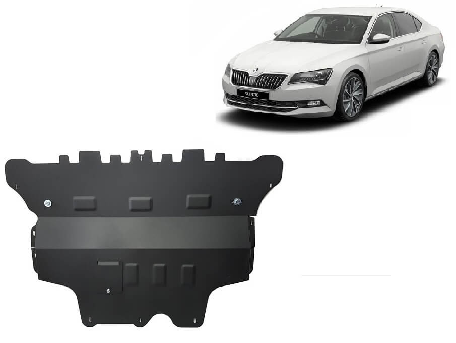 Pohjapanssari Skoda Superb manuaali (2015-2024), moottori, vaihdelaatikko, jäähdytin, etupuskuri, terästä