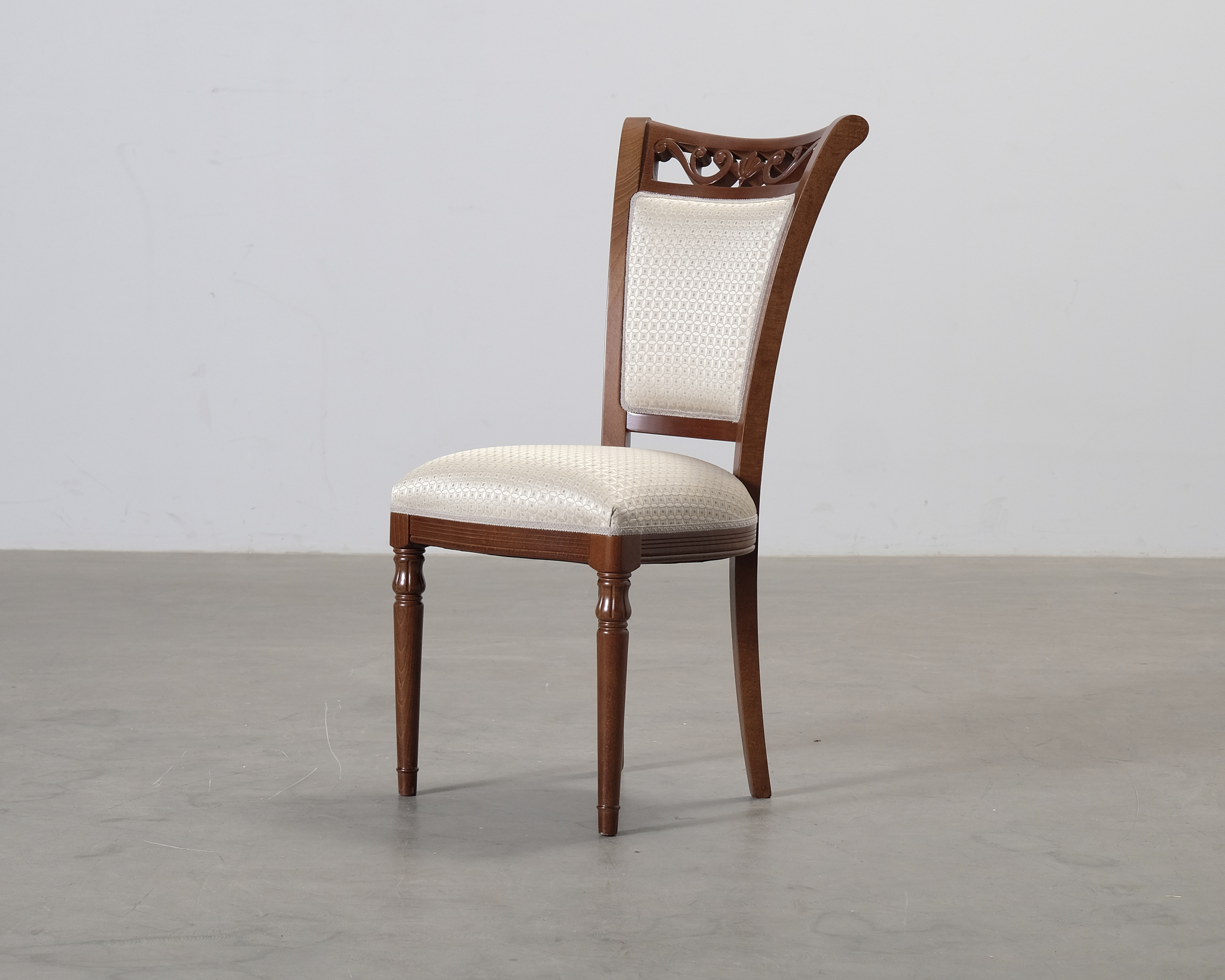 Tyylikäs klassikkotuoli, jossa yhdistyvät puinen runko, pehmeästi muotoillut jalat ja beiget verhoilukankaat. Selkänojan koristeelliset yksityiskohdat ja harkitut linjat tuovat tuoliin arvokkaan ja ajattoman ilmeen, joka sopii täydellisesti ruokailutilaan, olohuoneeseen tai makuuhuoneen istuimetuksi. Selkänojan yläosassa muutama naarmu. Toinen keskellä, toinen vasemassa reunassa.