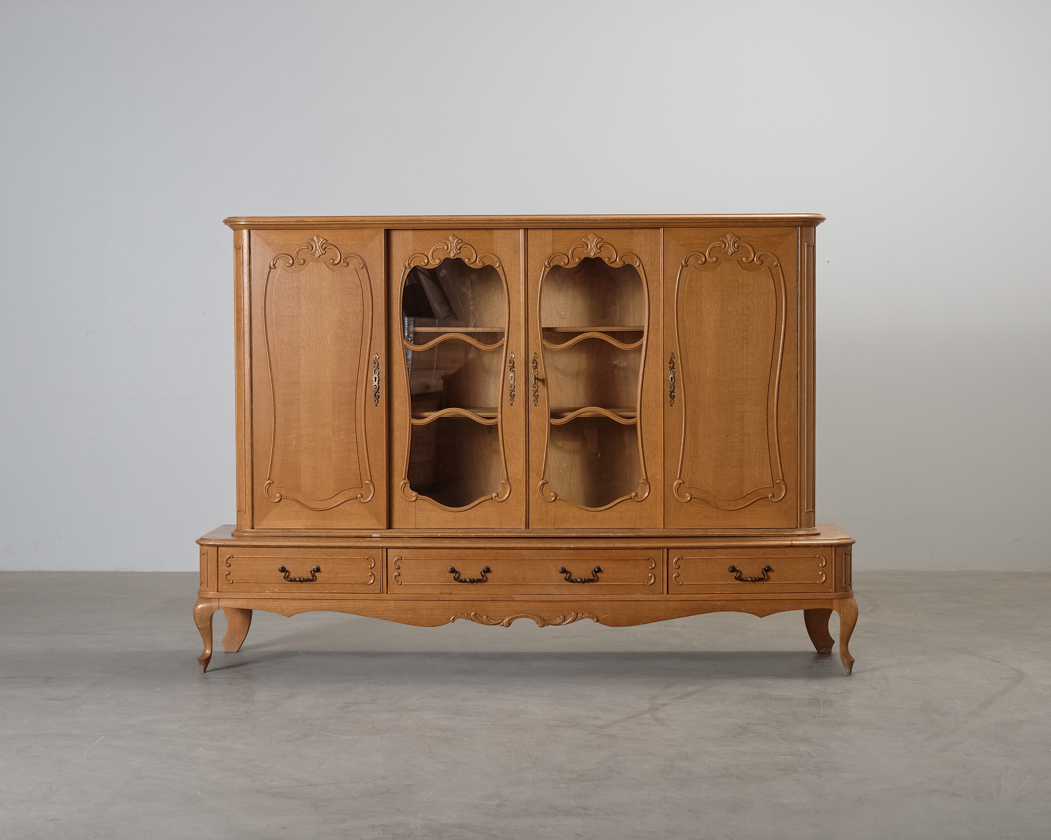 Klassinen iso vintage vitriinikaappi, joka tarjoaa runsaasti säilytystilaa esimerkiksi astioille. Kaapin vasemman oven lukkosalpa on rikki. Naarmuja, kolhuja, kulumaa ja jälkiä niin ulkopuolella kuin sisäpuoellakin. Alimmassa vetolaatikossa tussin jälkiä. Kaksi avainta tallessa.