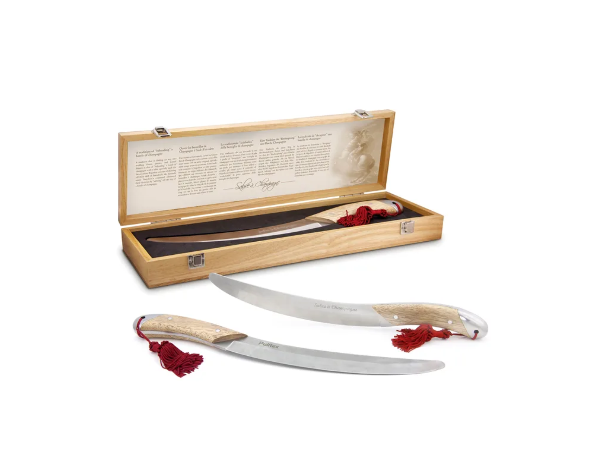 Pulltexin valmistama upea ja koristeellinen samppanjasapeli, joka on valmistettu ruostumattomasta teräksestä ja tammesta. Käyttämätön
