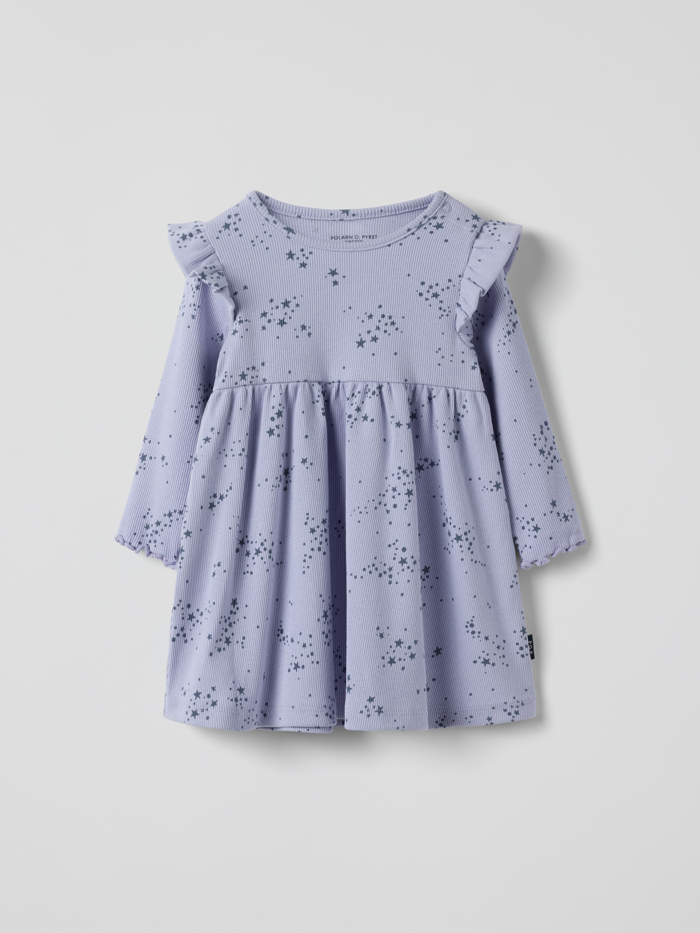 Pehmeä ribbimekko vauvalle, valmistettu luomupuuvillasta. Mekko on kuvioitu pienillä sydämillä ja olkapäillä on pienet röyhelöt. Kokovaihtoehdoissa 86–92 on toisella olkapäällä nepparit, mitkä helpottavat pukemista. Vaate sopii samisteluun! Tuoteturvallisuus: KEEP AWAY FROM FIRE<br/>Ribbimekko tähdet