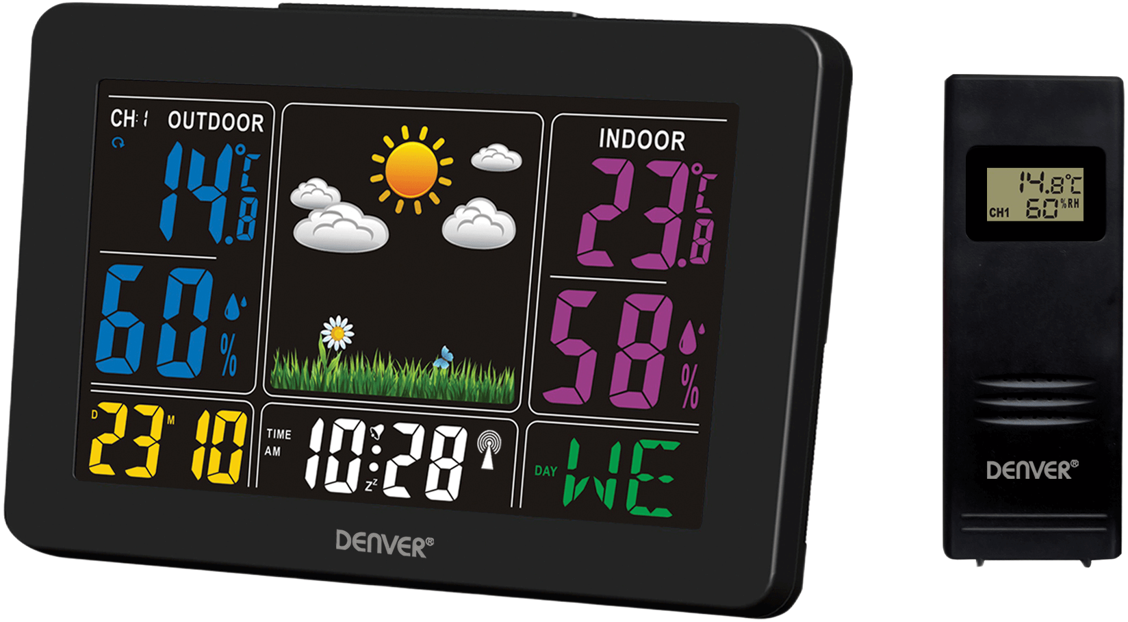Denver WS-540B on värinäytöllä varustettu sääasema, joka näyttää yhdellä silmäyksellä ajan, päivämäärän, sisä- ja ulkolämpötilan sekä ilmankosteuden. Radio-ohjattu kello pitää ajan automaattisesti oikeana, ja mukana tuleva ulkoanturi kertoo millainen sää oven toisella puolella oikeasti on. Selkeä näyttö ja helppo käyttö tekevät tästä kätevän lisän kotiin, mökille tai työpöydälle.