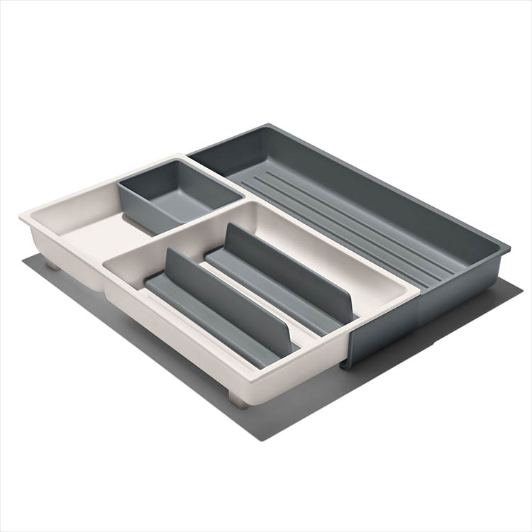 Joustavaa säilytystilaa erimuotoisille ja -kokoisille keittiövälineilleSäädettävä leveysLiukumaton alapuoliTämä kätevä sisälokero säädettävillä väliseinillä mukautuu työpöydän ja keittiön laatikoihin ja kaikille niiden välineille – olipa niissä sitten epäsäännöllisen muotoisia tai pitkiä tarvikkeita. Liukumaton alapuoli varmistaa myös, että lokero pysyy vakaasti paikallaan. Kätevä, tyylikäs ja käytännöllinen tapa pitää tavarat järjestyksessä!Mukauta keittiön vetolaatikoita säädettävillä jakajillaOlipa sinulla oudon muotoisia vispilöitä, pitkävartisia lusikoita tai pieniä pussinsulkijoita, ne sopivat nyt paikalleen yhtä helposti kuin tavalliset ruokailuvälineet. Säädettävien jakajien avulla voit luoda räätälöityjä osastoja kaikille keittiövälineillesi, ja lokeron leveys voidaan helposti mukauttaa vetolaatikkosi kokoon. Irrotettavan rakenteen ansiosta se on myös helppo puhdistaa.Liukumaton alapuoli lisää vakauttaLiukumattoman alapuolen ansiosta lokero istuu paikalleen ja tarttuu tehokkaasti kaapin tai laatikon pohjaan.Pakkauksen sisältöRuokailuvälinelaatikko1 ruokailuvälinelaatikko 3 lokerolla2 irroitettavaa jakajaa1 irroitettava säilytysastia1 säädettävä lokero isommille välineilleKeittiövälinelaatikko1 lokero irtotavaroille2 irroitettavaa jakajaa1 irroitettava säilytysastia1 säädettävä lokero isommille välineilleTekniset tiedotVäri: Harmaa, valkoinenPituus: 41,5 cmLeveys: 25 - 45,9 cmKorkeus: 6,35 cm