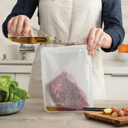 Vähentää muovipussien käyttöä100 % elintarvikehyväksyttyä silikoniaKestää korkeaa lämpöä ja pakastustaTämä ilmatiivis pussi on ympäristöä säästävä vaihtoehto tavalliselle muovipussille. Säilytyspussin takana on Stasher, joka valmistaa kestäviä ja uudelleenkäytettäviä laadukkaita silikonipusseja. Pussi on helppo avata ja sulkea. Siinä on ilmatiivis suljin.Pussi on valmistettu 100 % elintarvikehyväksytystä silikonista, ja sitä voidaan käyttää kaikentyyppisten ruokien säilyttämiseen niin kuivakaapissa, jääkaapissa kuin pakastimessakin. Saatavana useassa eri koossa. Pienempi pussi sopii voileiville, omenaviipaleille, marjoille tai pähkinöille. Hieman isompiin pusseihin taas mahtuvat juustot ja vihannekset. Niitä voi myös käyttää marinadipussina. Suljin suojaa kosteudelta, minkä vuoksi pussi sopii erinomaisesti myslin, riisin, keksien ja muiden kuivatuotteiden säilyttämiseen.Säilytyspussia voi lämmittää myös uunissa tai mikroaaltouunissa, ja se on lämmönkestävä 200 °C asti. Huomaa, että pussin tulee olla auki kun valmistat ruokaa uunissa tai mikrossa. Ruoan voi myös vakuumipakata pussiin ja valmistaa sous vide -kypsentimessä. Laske pussi vedellä täytettyyn kattilaan niin, että ilma pääsee pois pienestä aukosta. Sulje sitten pussi aivan vedenpinnan yläpuolella.Läpinäkyvä säilytyspussi on kätevä sekä kotona että matkalla. Vedenpitävä pussi soveltuu myös nesteiden kuljettamiseen lentokoneessa, joten saat siihen pakattua kätevästi esimerkiksi meikit, lääkkeet tai elektroniikkaa. Stasher-yrityksen tavoitteena on vähentää merkittävästi muovipussien käyttöä. Se lahjoittaa 1 % kokonaisliikevaihdostaan \"1% For The Planet\"-organisaatiolle, jonka tavoitteena on edistää ympäristön hyvinvointia maailmanlaajuisesti.Stasher Bag -säilytyspussia on saatavana eri ko’oissa:290 ml: 12 cm x cm450 ml 18 cm x cm1680 ml: 18 cm x 21,5 cm x 6 cm1920 ml: 21,5 cm x cmSäilytyspussit on valmistettu platinasilikonista, joka on myrkytön ja hypoallergeeninen sekoitus piitä (hiekkaa) ja oksideja (happea). SIlikonista ei tartu ruokaan hajuja tai makua. Astianpesukoneen kestävä.