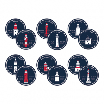 Kitkaa, täydellinen veneeseenKaksipuoliset kuviot ruotsalaisilla majakoilla tai kompassiruusuillaLämmönkestävä, valmistettu 100% silikonistaNämä käytännölliset silikoniset lasialuset tuovat sisustukseen saariston henkeä ja ne sopivat erinomaisesti lahjaksi veneen omistajalle tai muuten vain saaristossa viihtyvälle. Jokaisessa alusessa on kompassiruusu ja kuuluisa ruotsalainen majakka molemmin puolin.Lasinalusissa on erittäin hyvä kitka ja silikonipinnan ansiosta lasi ei luista helposti, vaikka se kallistuisikin. Lasinalusen voi asettaa myös lasin päälle estämään hyönteisten päätymistä lasin sisään. Aluset ovat lämmönkestäviä, joten niitä voidaan käyttää myös kuumien lasien ja astioiden alla.Pakkaukseen sisältyy kuusi laivastonsinistä lasinalusta. Saatavilla kolme erilaista pakkausta. Lasinalusten molemmin puolin on kuvia ruotsalaisista majakoista sekä niiden pituus- ja leveysasteet. Kuvituksena länsi-, etelä- ja itärannikoiden majakoita. Saatavilla myös pakkaus, jossa lasinalusten kuviona on kompassiruusu. Kuviopuoli on valkoinen ja laivastonsininen, tausta punainen ja valkoinen.Majakat Länsirannikko: Hållö/Måseskär, Pater Noster/Vinga, Tistlarna/Nidingen, Morups Tånge/Tylön, Kullen/Helsingborg, Malmö Inre/Falsterbo.Majakat Itärannikko Långe Jan/Långe Erik, Stora Karlsö/Gotska Sandön, Landsort/Svenska Högarna, Söderarm/Örskär, Brämön/Bergudden, Rödkallen/Malören.Majakat Etelärannikko Gotska Sandön/Stora Karlsö, Långe Jan/Långe Erik, Utklippan/Hanö, Sandhammaren/Smygehuk, Falsterbo/Malmö Inre, Helsingborg/Kullen.Lasinaluset kestävät lämpöä 230°C asti ja ne voidaan pestä astianpesukoneessa.Halkaisija: 9 cmLasinalusten määrä per pakkaus: 6 kpl
