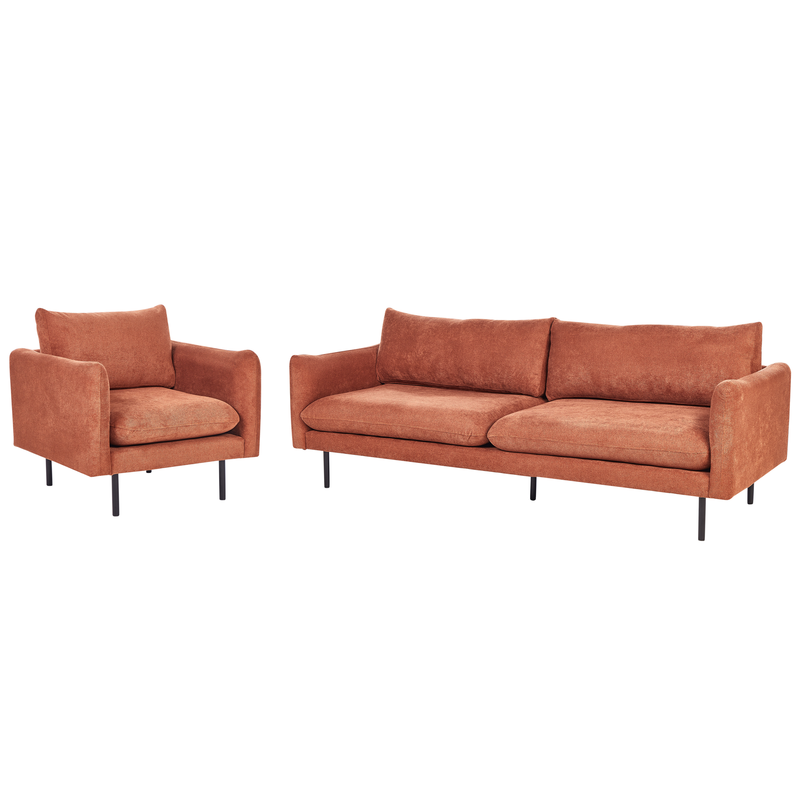 Retrotyylinen sohvasetti neljälle. Tämä 4-istuttava sohvaryhmä muuttaa minkä tahansa olohuoneen rentoutumisen ja vapaa-ajan viettopaikaksi. Runsaasti pehmustettujen istuin- ja selkätyynyjen ansiosta setti on pehmeä ja mukava. Kalusteiden kestävät puurungot ja alumiiniset jalat takaavat vakauden, kun taas pehmeä kangasverhoilu antaa niille tyylikkään ilmeen erottuvan kiiltonsa ansiosta. Sohvasetistä tulee hetkessä minkä tahansa sisustuksen kohokohta, olipa kyseessä sitten moderni, perinteinen tai industriaalinen sisustus.Tuotetiedot: Tuotetyyppi: Sohvaryhmä Tyyli: Moderni Pääväri: Ruskea Sävy: Kullanruskea Materiaali: Kangas Päämateriaali: Chenille Lisämateriaali: Vaneri Täytemateriaali: Vaahtomuovi Materiaaliyhdistelmä: 100% polyesteriä Käsinojan tyyli: Suorat Istuimen koostumus: Siksak-jousitus Istuimen vaahtomuovin tiheys: 50 kg/m3 Istumapaikat: 4 hengelle Vuodetoiminto: Ei Mitat: 3-istuttavan sohvan mitat: 220x84x86 Nojatuolin mitat: 83x84x86 Istuimen paksuus: 16 cm Istuimen korkeus: 44 cm Kokonaismitat: 220x85x85 Paino: 78 kg Kantokyky per hlö: 120 kg Hintaan sisältyy: 1 x Nojatuoli, 1 x 3-istuttava sohva Ominaisuudet: Paksusti pehmustettu mukavuuden takaamiseksi, Tuo tyyliä sisustukseen, Vankka rungon rakenne, Korkealaatuiset materiaalit, Täysin verhoiltu, Jaloissa tapit lattian suojaamiseen Kokoaminen: Jalat asennettava. 20-40 min. Lisätiedot: Kuljetussyistä jalat ovat istuimen alapuolella olevassa taskussa.