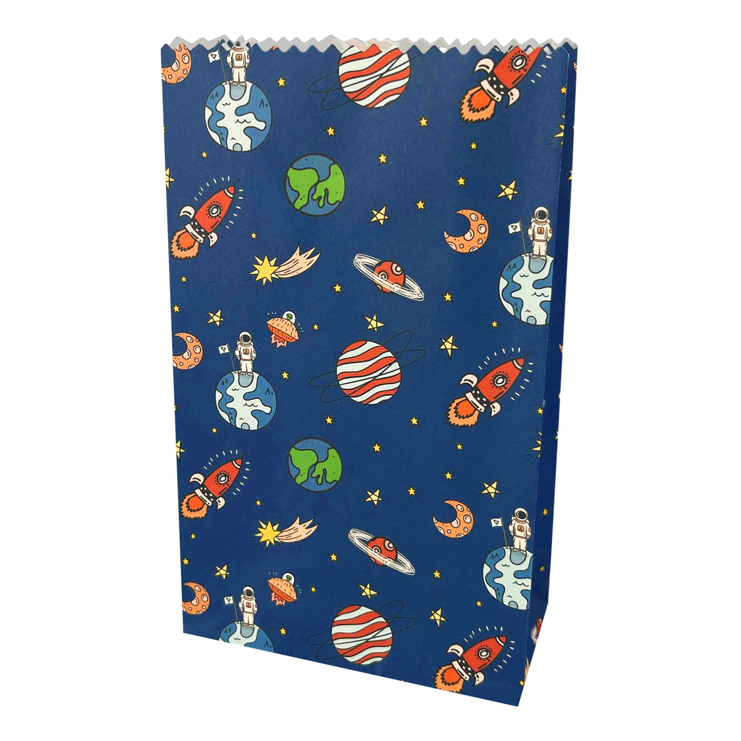 3… 2… 1… lähtö! Nyt on aika singauttaa juhlat suoraan galaksiin! Näiden avaruusteemaisten karkkipussien avulla jokaisesta pienestä vieraasta tulee oikea astronautti, jonka tehtävänä on kerätä omat karkit – täydellinen valinta juhliin, jotka tähtäävät kohti tähtiä ja kauas arjen tylsien naposteltavien tuolle puolen.<br /><br />Godispåsar Space World on värikkäitä juhlapusseja FSC-sertifioidusta paperista, ja niissä on leikkisiä planeetta-, raketti- ja astronauttikuvioita. Pussit ovat täysin muovittomia ja sopivat mainiosti täytettäviksi karkeilla, pienillä leluilla tai muilla yllätyksillä juhlaväelle. Itsestään selvä valinta avaruusteemaan ja seikkailuntäyteisiin lastenjuhliin!<br /><br /><ul><li>Materiaali: FSC-sertifioitu paperi</li><li>Ei sisällä muovia</li><li>Kuvitus: avaruusteema</li><li>Mitat: 12 x 20 cm</li><li>Määrä: 8-pakkaus</li></ul>