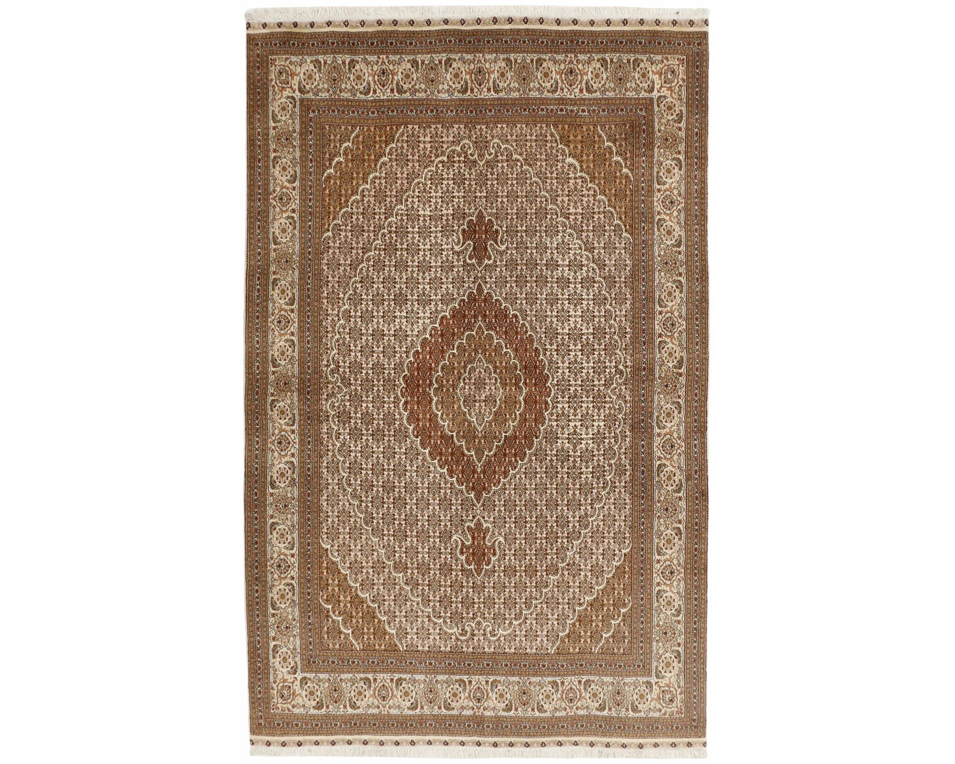 Tabriz 40 Mahi -matot ovat käsinsolmittuja villamattoja, joissa on puuvillaloimi. Noin 400 000 solmun solmutiheys neliömetrillä korostaa kuvioinnin yksityiskohtia ja ilmentää Tabriz-mattojen korkeaa laatutasoa. Kuviointi koostuu Mahi-kuvioista, jossa pienet lehtimäiset muodot toistuvat tiheänä kokonaisuutena ja muodostavat yhtenäisen, medaljonkimaisen sommitelman maton pintaan. Käyttämätön.