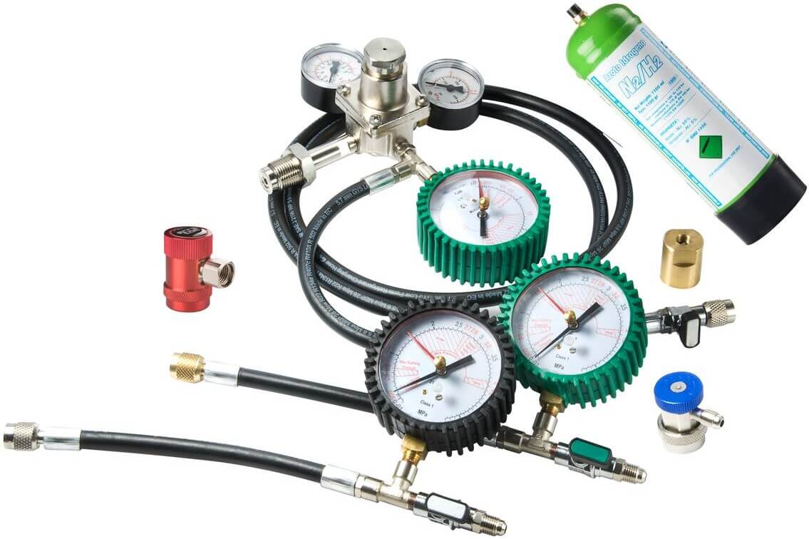 Kompakti typpitäyttösarja, jossa 1 litran pullo 95 % typpi + 5 % vety -seosta, paineensäädin sekä paine- ja vuodonilmaisinadapterit. Sopii ilmastointijärjestelmien vuotojen etsintään ja painekoestukseen.