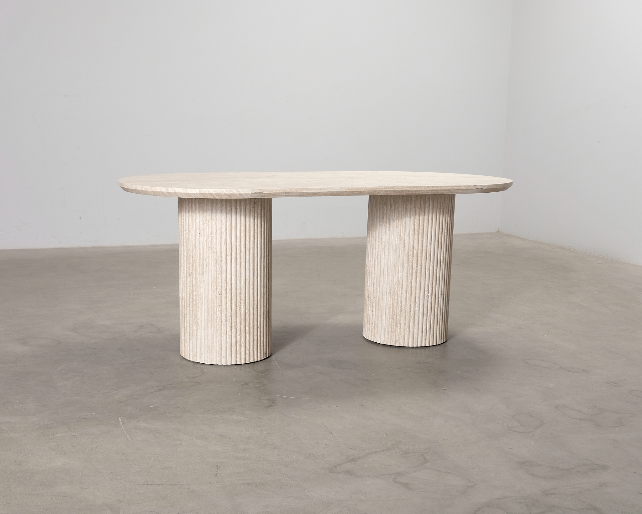 Luo toiminnallinen, mutta elegantti ruokailutila tällä Uppveda-pöydällä. Pöydän kansi on valmistettu MDF:stä ja jalassa on tyylikäs panelointi. Pöylevyn reunassa kolhuja ja pieniä vaurioita. Yleisvaikutelma hyvä.
