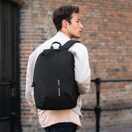 Piilotetut lokerot ja lukittava vetoketjuTilaa 15,6 tuuman kannettavalle tietokoneelleVettä hylkivä materiaaliVarkaudenestoreppu Bobby Soft on mukavantuntuinen reppu, jossa esineet pysyvät tallessa. Reppu on vettä hylkivä, siinä on piilotaskut ja lukittava vetoketju päälokeroon, jota voidaan tarvittaessa myös suurentaa.Kun reppu on käytössä, ovat kaikki taskut ja vetoketjut varkailta piilossa. Päälokeron lukittava vetoketju sijaitsee selän takana, joten epärehelliset yritykset on helppo huomata. Olkahihnassa on vetoketjullinen korttitasku ja selän takana RFID-suojattu tasku, jossa voi säilyttää esimerkiksi passia tai lompakkoa.Repun sisällä on useita taskuja ja lokeroita sekä avaimenperä, johon voi kiinnittää avaimet. Pehmustetussa isossa lokerossa on tilaa 15,6 tuuman kannettavalle tietokoneelle ja pienempään taskuun mahtuu 9,7 tuuman tabletti. Päälokeroa on mahdollista laajentaa, jotta esimerkiksi lämpimän pusakan voi pakata mukaan.Integroituun USB-liitäntään voi kytkeä varavirtalähteen. Varavirtalähde asetetaan reppuun ja johto kytketään repun sisäpuolella olevaan liitäntään. Matkapuhelimen latauskaapelin voi nyt kytkeä varavirtalähteeseen, ja puhelin latautuu turvallisesti repun sisällä. Huom. Varavirtalähde ostettava erikseen.Bobby Soft on valmistettu vedenpitävästä materiaalista. Heijastavan tekstin ja kuvion ansiosta repun käyttäjä näkyy pimeässä. Ulkopuolella on myös pieni käsimatkatavarahihna. Repun saa hihnan avulla kiinni käsimatkatavaraan.Bobby Soft -reppu on valmistettu kierrätetyistä materiaaleista. Jokaiseen Bobby Soft -reppuun on käytetty 37 uudelleenkierrätettyä pulloa, joten valmistusprosessissa säästyy 22 litraa vettä jokaista reppua kohden.Tilavuus: litraa / 16 litraaMitat: 45 cm x 30 cm x 18 cmMateriaali: rPET