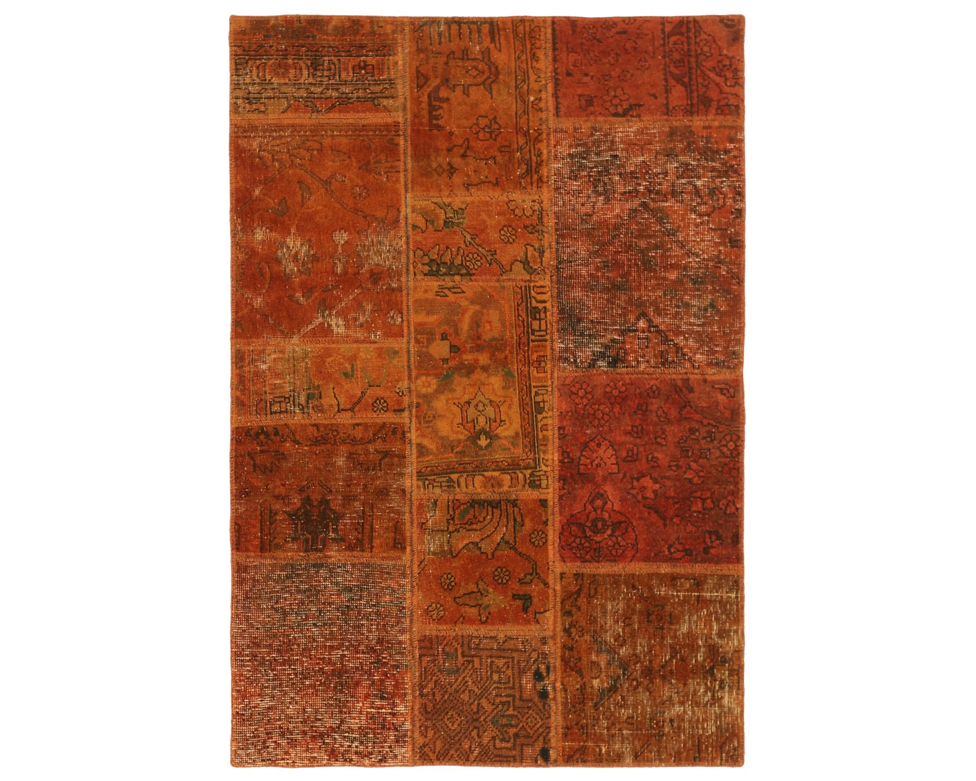Vintage Royal Patchwork -matot valmistetaan persialaisista villamatoista, jotka on leikattu pienemmiksi paloiksi ja koottu uudelleen tilkkutäkkimäiseksi sommitelmaksi. Palat kivipestään ja värjätään uudelleen, jolloin alkuperäinen kuviointi jää hienovaraisesti näkyviin ja pinta saa pehmeän, kerroksellisen ilmeen. Vaihtelut sävyissä ja palojen kuvioissa tekevät jokaisesta Vintage Royal Patchwork -matosta ainutlaatuisen. Käyttämätön.