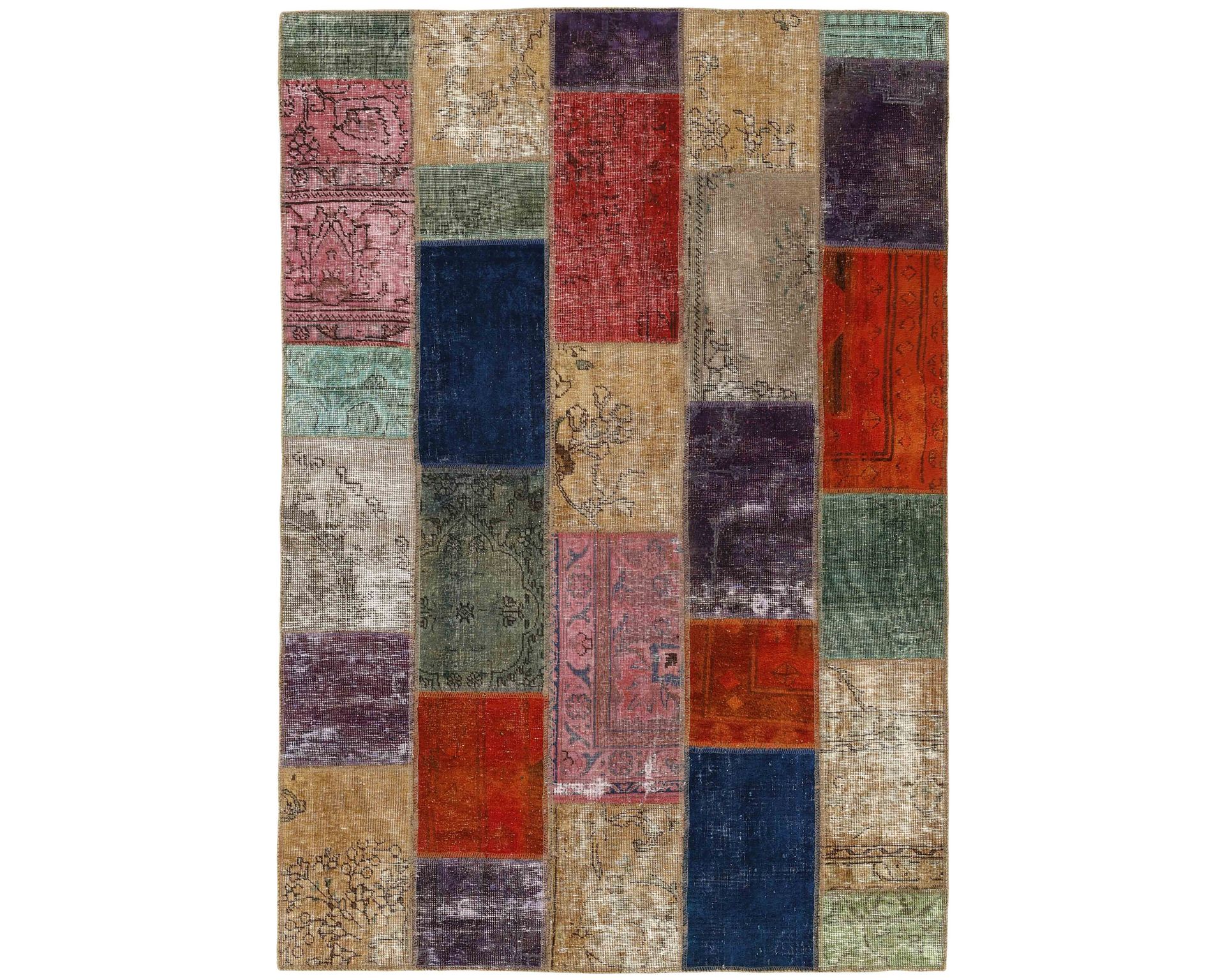 Vintage Royal Patchwork -matot valmistetaan persialaisista villamatoista, jotka on leikattu pienemmiksi paloiksi ja koottu uudelleen tilkkutäkkimäiseksi sommitelmaksi. Palat kivipestään ja värjätään uudelleen, jolloin alkuperäinen kuviointi jää hienovaraisesti näkyviin ja pinta saa pehmeän, kerroksellisen ilmeen. Vaihtelut sävyissä ja palojen kuvioissa tekevät jokaisesta Vintage Royal Patchwork -matosta ainutlaatuisen. Käyttämätön.