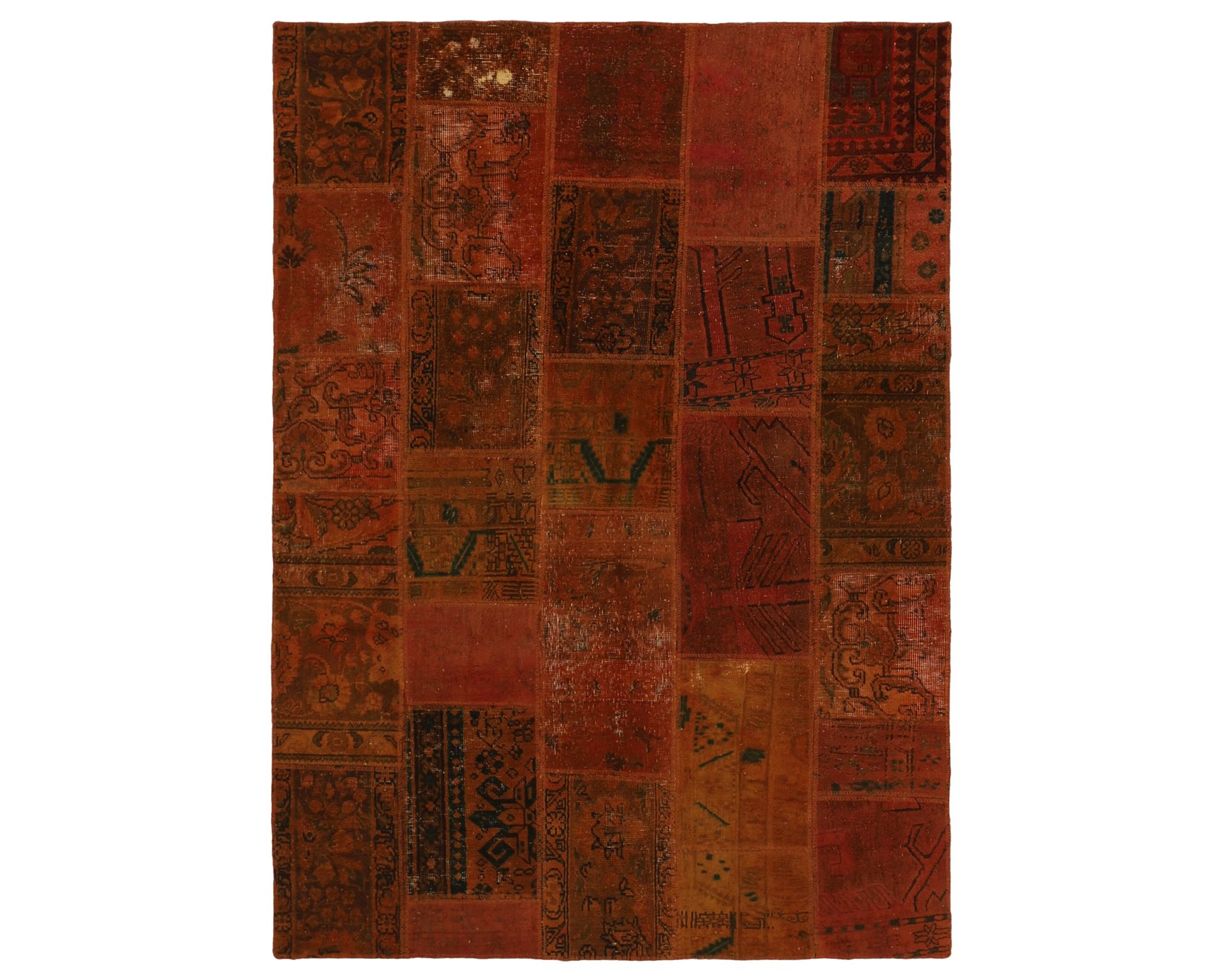 Vintage Royal Patchwork -matot valmistetaan persialaisista villamatoista, jotka on leikattu pienemmiksi paloiksi ja koottu uudelleen tilkkutäkkimäiseksi sommitelmaksi. Palat kivipestään ja värjätään uudelleen, jolloin alkuperäinen kuviointi jää hienovaraisesti näkyviin ja pinta saa pehmeän, kerroksellisen ilmeen. Vaihtelut sävyissä ja palojen kuvioissa tekevät jokaisesta Vintage Royal Patchwork -matosta ainutlaatuisen. Käyttämätön.