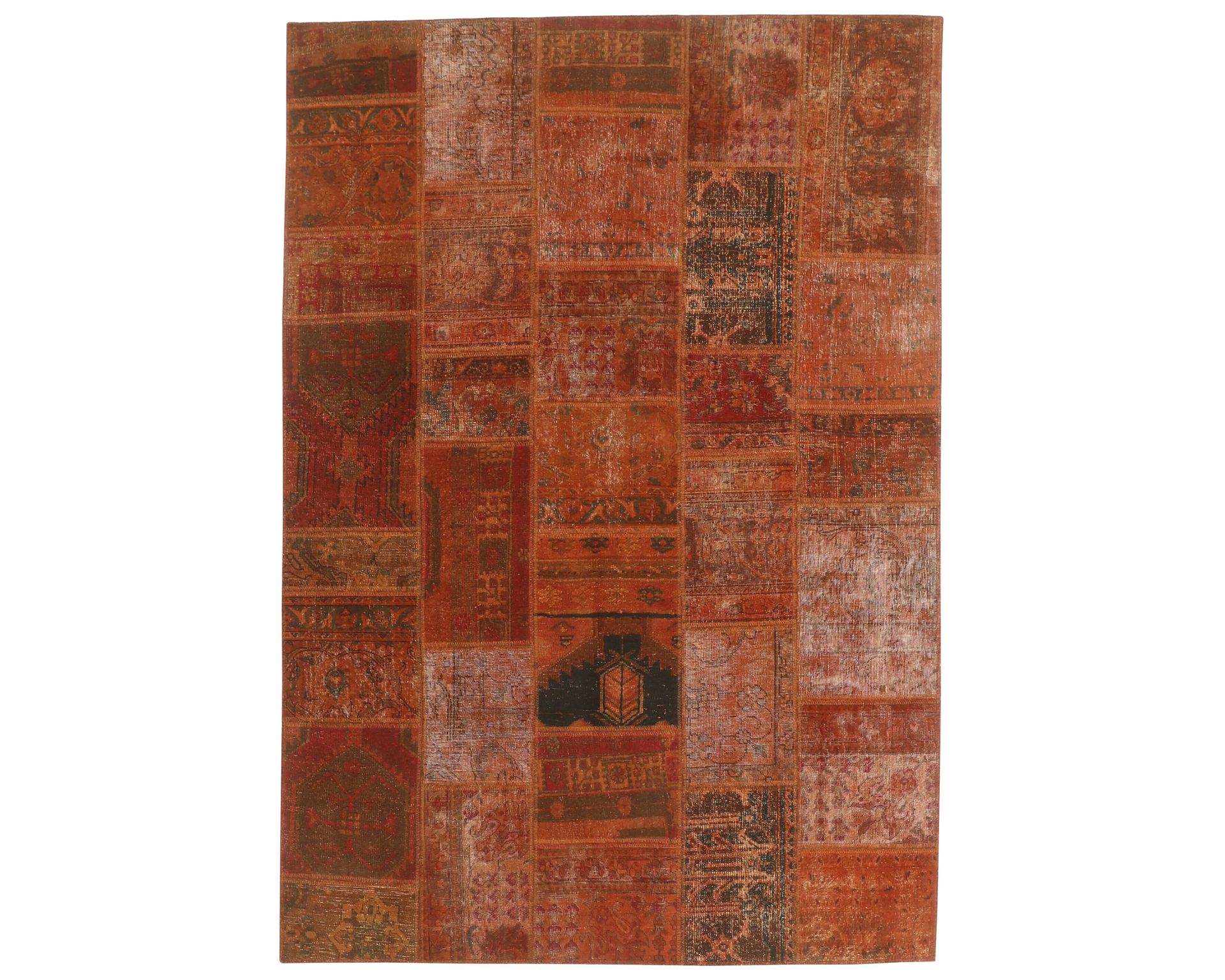 Vintage Royal Patchwork -matot valmistetaan persialaisista villamatoista, jotka on leikattu pienemmiksi paloiksi ja koottu uudelleen tilkkutäkkimäiseksi sommitelmaksi. Palat kivipestään ja värjätään uudelleen, jolloin alkuperäinen kuviointi jää hienovaraisesti näkyviin ja pinta saa pehmeän, kerroksellisen ilmeen. Vaihtelut sävyissä ja palojen kuvioissa tekevät jokaisesta Vintage Royal Patchwork -matosta ainutlaatuisen. Käyttämätön.
