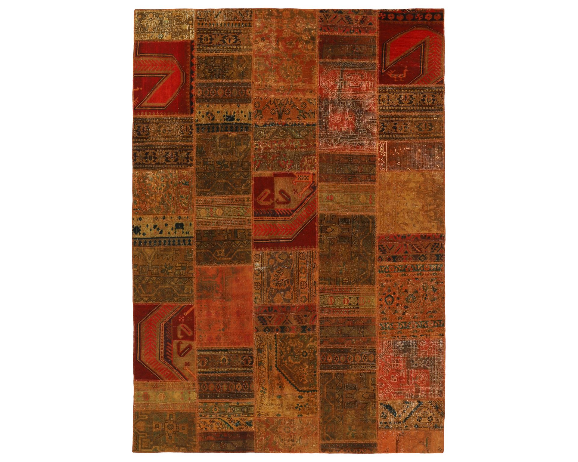 Vintage Royal Patchwork -matot valmistetaan persialaisista villamatoista, jotka on leikattu pienemmiksi paloiksi ja koottu uudelleen tilkkutäkkimäiseksi sommitelmaksi. Palat kivipestään ja värjätään uudelleen, jolloin alkuperäinen kuviointi jää hienovaraisesti näkyviin ja pinta saa pehmeän, kerroksellisen ilmeen. Vaihtelut sävyissä ja palojen kuvioissa tekevät jokaisesta Vintage Royal Patchwork -matosta ainutlaatuisen. Käyttämätön.