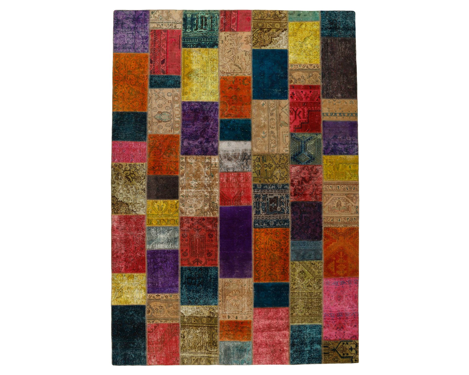 Vintage Royal Patchwork -matot valmistetaan persialaisista villamatoista, jotka on leikattu pienemmiksi paloiksi ja koottu uudelleen tilkkutäkkimäiseksi sommitelmaksi. Palat kivipestään ja värjätään uudelleen, jolloin alkuperäinen kuviointi jää hienovaraisesti näkyviin ja pinta saa pehmeän, kerroksellisen ilmeen. Vaihtelut sävyissä ja palojen kuvioissa tekevät jokaisesta Vintage Royal Patchwork -matosta ainutlaatuisen. Käyttämätön.