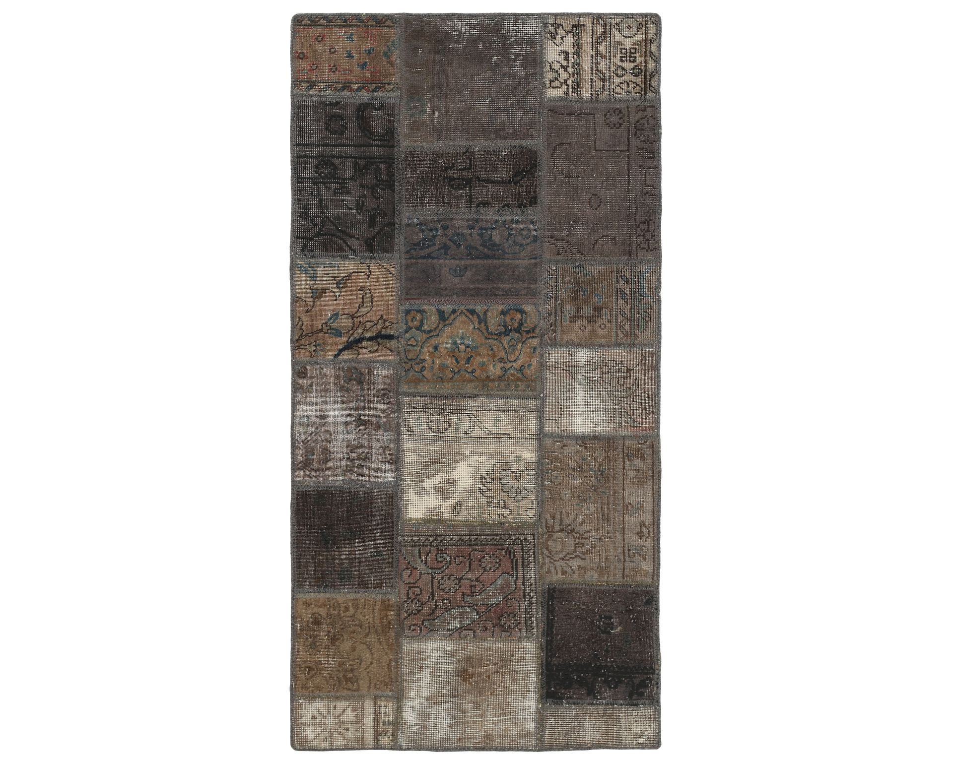 Vintage Royal Patchwork -matot valmistetaan persialaisista villamatoista, jotka on leikattu pienemmiksi paloiksi ja koottu uudelleen tilkkutäkkimäiseksi sommitelmaksi. Palat kivipestään ja värjätään uudelleen, jolloin alkuperäinen kuviointi jää hienovaraisesti näkyviin ja pinta saa pehmeän, kerroksellisen ilmeen. Vaihtelut sävyissä ja palojen kuvioissa tekevät jokaisesta Vintage Royal Patchwork -matosta ainutlaatuisen. Käyttämätön.