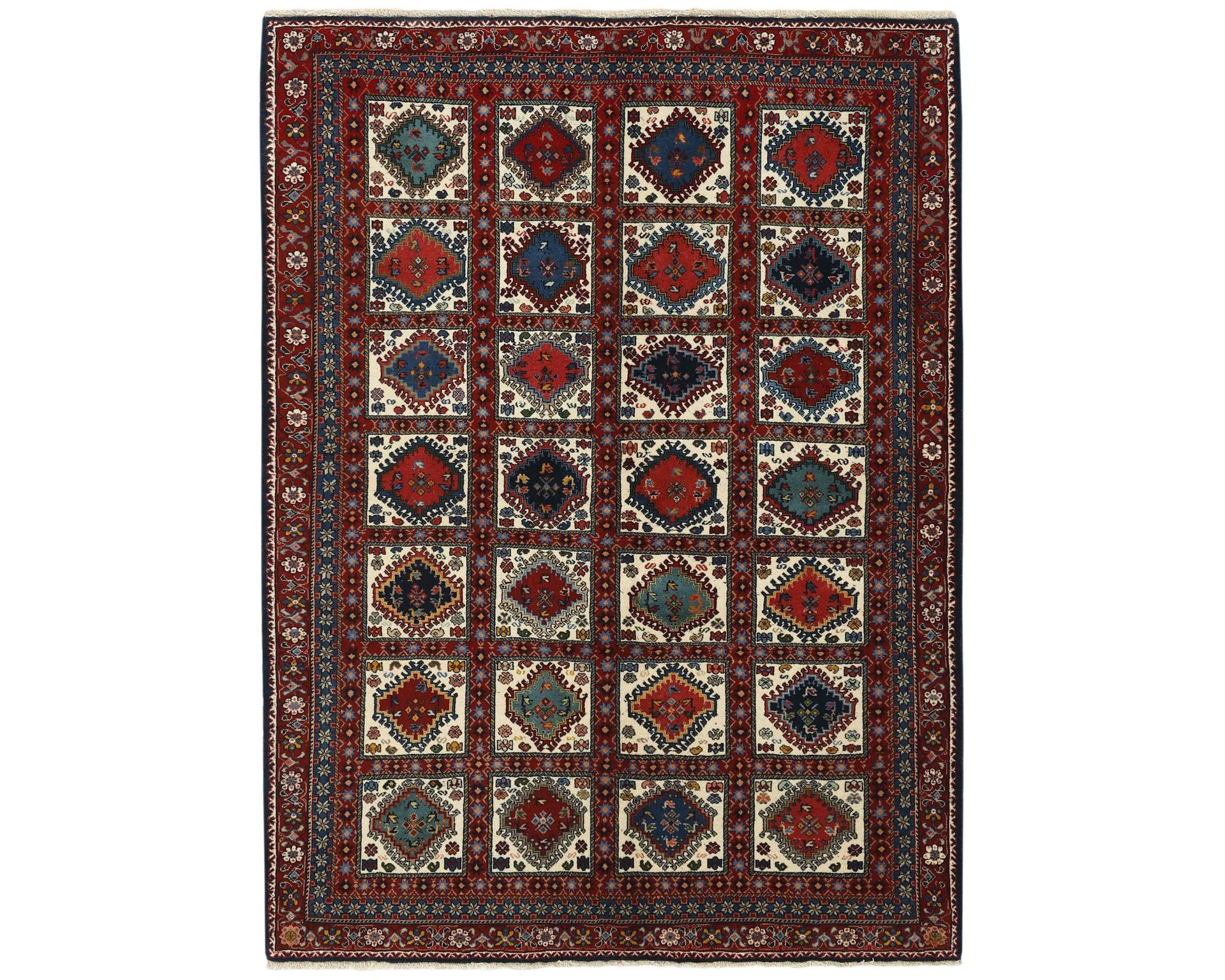 Yalameh-matot ovat käsinsolmittuja villamattoja, joille ovat ominaisia monimuotoiset tribalikuvioinnit ja rohkea värien käyttö. Vaikka Yalameh-matoissa hyödynnetään koneellisesti kehrättyä villaa, niiden pinnassa on kauniin pehmeä kiilto ja luonnollinen elo. Solmutiheys vaihtelee 250 000–350 000 solmun välillä neliömetrillä. Käyttämätön.
