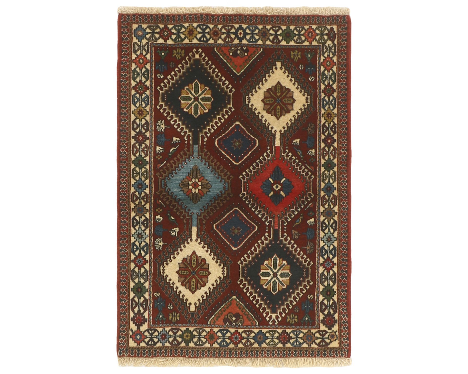 Yalameh-matot ovat käsinsolmittuja villamattoja, joille ovat ominaisia monimuotoiset tribalikuvioinnit ja rohkea värien käyttö. Vaikka Yalameh-matoissa hyödynnetään koneellisesti kehrättyä villaa, niiden pinnassa on kauniin pehmeä kiilto ja luonnollinen elo. Solmutiheys vaihtelee 250 000–350 000 solmun välillä neliömetrillä. Käyttämätön.